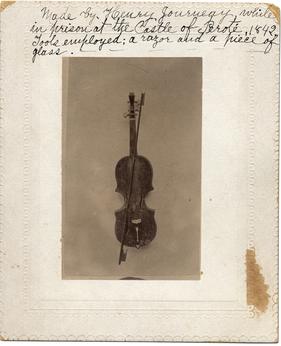 Henry Journeay was a survivor of the “Black Bean Episode.” He immigrated to Texas from Staten Island, New York, at the age of 27. Journeay is said to have crafted this violin from wood scraps left over from a chair made for Santa Anna, using glass and a razor as his tools. According to legend, Journeay played the fiddle to entertain the Texan prisoners. After his release from the Mexican prison, Journeay returned to Texas and operated a successful wood mill in Galveston. He died in 1870 from injuries received in a street car accident.