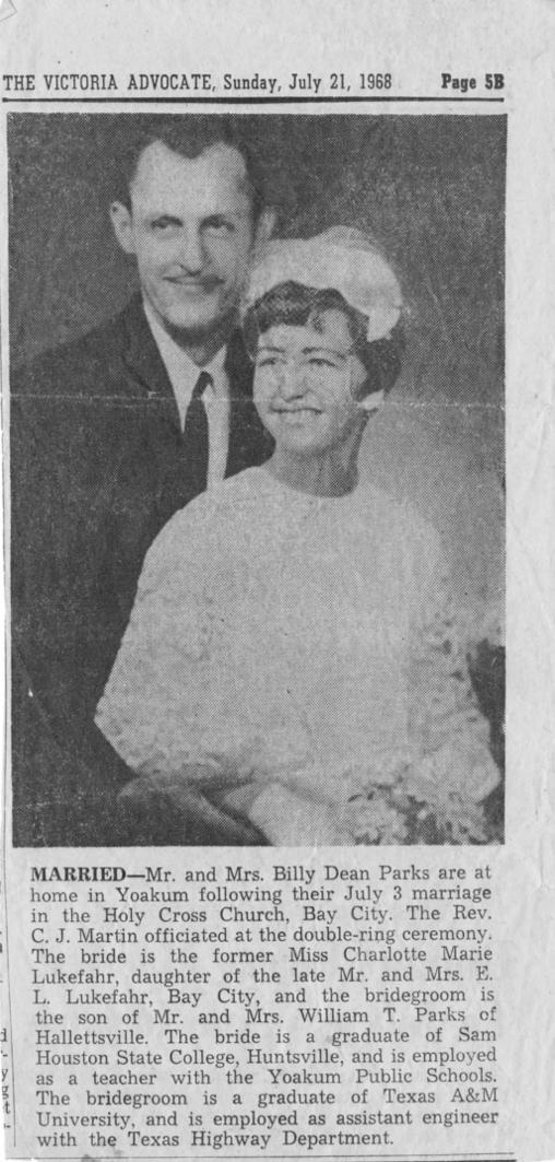 I want to take you back to the depression days, particular in central Nebraska in 1939. The last sibling of Edgar and Elsie Lukefahr was born. Later that year, the family moved south to Bay City, Texas. Another event occurred in November of that year, the marriage of Bill Parks and Iva Brown. History has it that Bill swam his horse across the Navidad River the prior Christmas to give Iva a box of chocolate candy.