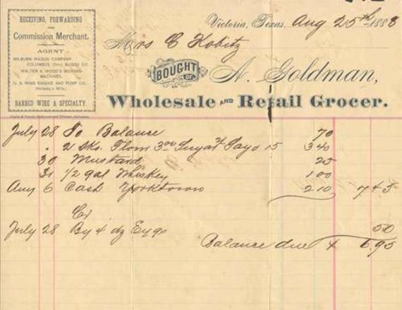 1888 Grocery List A Goldman Grocer, Victoria, Texas