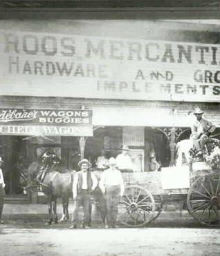(L-R) Eugene Damiano Depine, A. Goldman and Joe Depine (Eugene's second oldest son) in wagon. Sign on wagon reads "First Bale 1913 Raised by Eugene Depine. Ginned by Goldman Ginnery & Mills. Weight 440 Ibs." Roos Hardware Store and Studebaker Wagons and Buggies Store are in background, 102-104 S. Liberty.