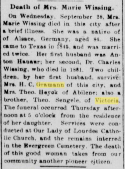 At the age of 84, Marie passed away in Victoria on September 28, 1904. She is buried in Evergreen Cemetery (28°48'N 97°00'W). Anton, Marie and Charles were all early pioneers, helping establish Victoria, Texas.