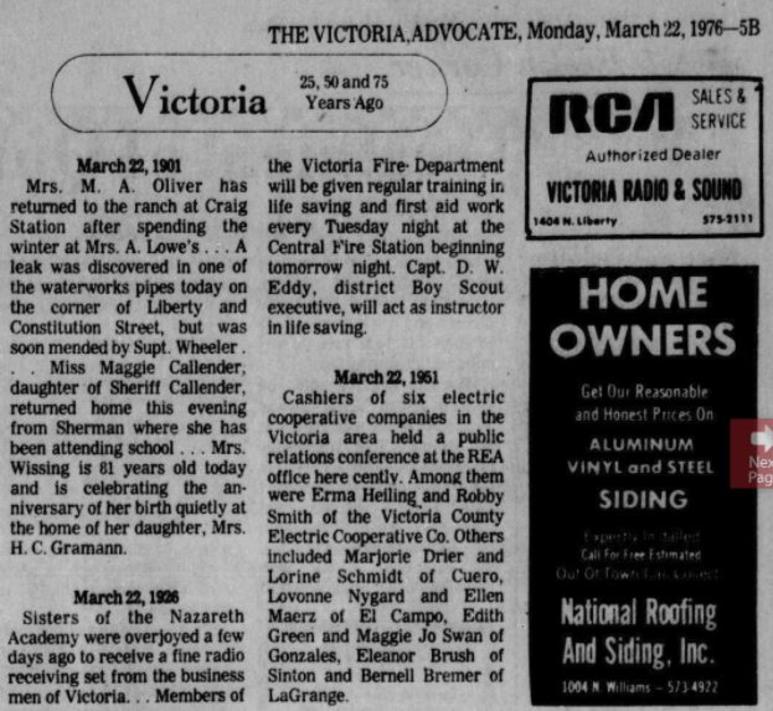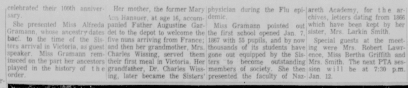 Marie and Charles did not have children of their own, but it was clear that Charles was considered a father by the family, as recounted by Marie’s granddaughter, Alfreda Gramann, in the following December 4, 1966, Victoria Advocate newspaper article about a PTA meeting for Nazareth Academy.