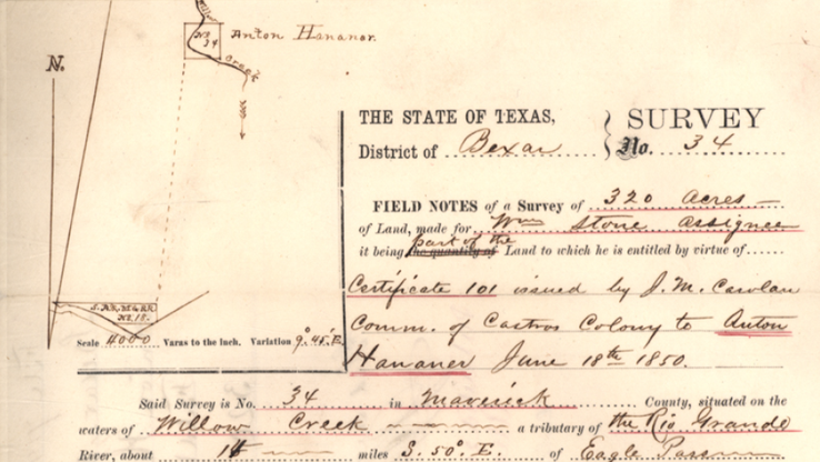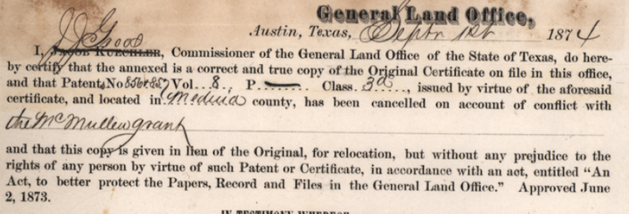 However, that title was subsequently voided, and in 1874, after a long and hard fought legal effort[3], two tracts in Maverick County, a few miles southesast of Eagle Pass, were granted to Sophia and Anna, as the sole heirs of Anton.