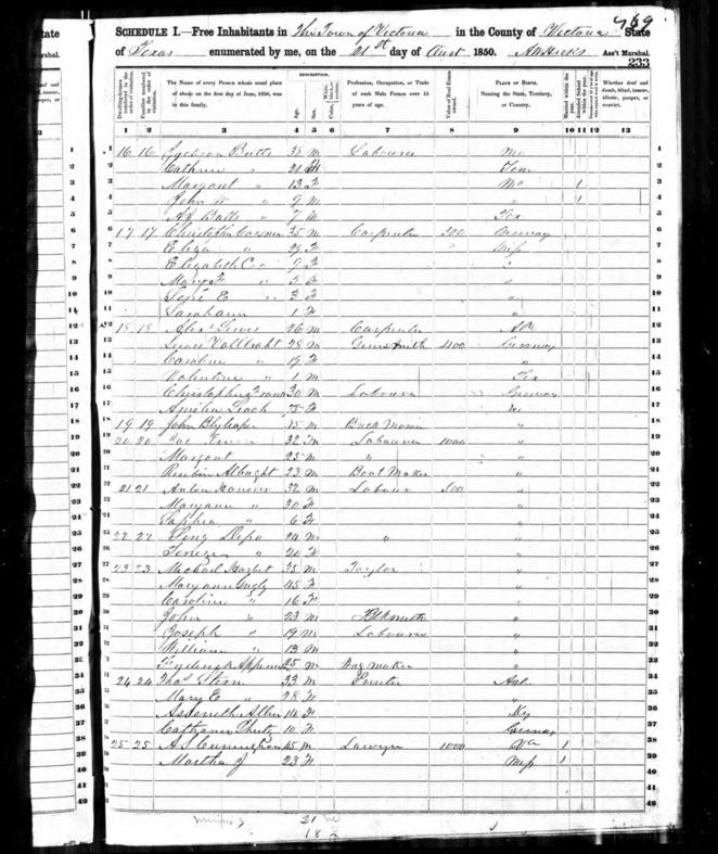 The 1850 Census shows Anton, Marie and Sophie living in the Town of Victoria, Nanette having died in the cholera epidemic of 1846. It is likely they were living in a house on 201 E. Forrest Street (28°47'N 97°00'W), said to have been built by Marie’s brother, Theobald, a noted carpenter and builder of Victoria.