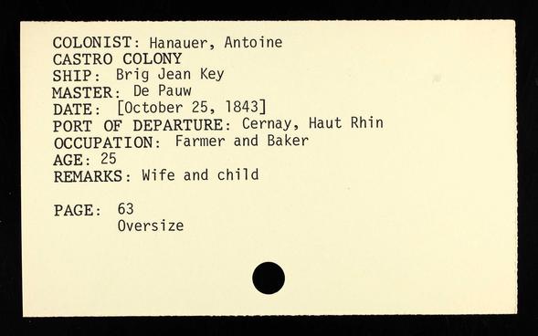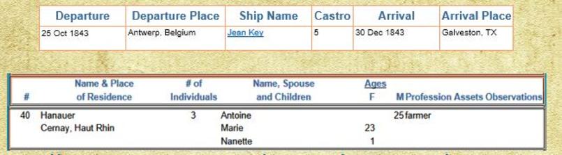 Anton, Marie and Nanette boarded the Brig Jean Key and departed Antwerp, Belgium, on October 25, 1843, and landed in Galveston on December 30, 1843. Sophie Caroline was born 2 weeks before the arrival in Galveston. The Jean Key was the 5th of 27 shiploads of Castro colonists[1].
