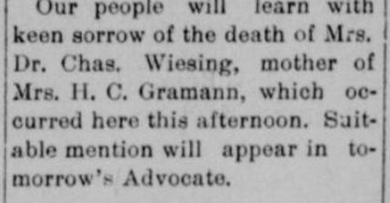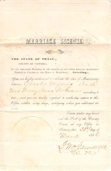 Charles actively practiced medicine for 26 years and opened the first drug store in Victoria. He died at the age of 56, in 1881, and is buried in Evergreen Cemetery. On the basis of Charles’s assistance to the wounded during the Civil War, Marie was posthumously made a member of the Daughters of the Confederacy (application made by Marie Anna Gramann in 1922), having been made an honorary member of the William P. Rogers Chapter in 1899.