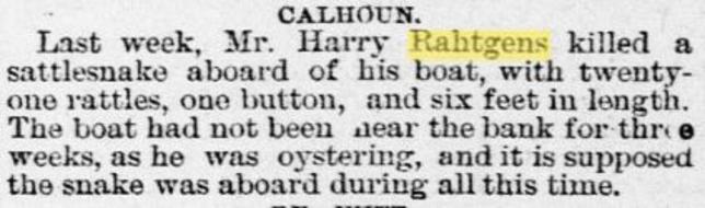 Harry was born February 20, 1853, at Brazos Santiago, Texas (26°03'N 97°09'W) , to parents Alice Ellen and Henry Rahtgens. Like his father, Harry was a man of the sea, and was born aboard a ship. He was listed as a coastal sailor in the 1870 census and as a captain of a schooner in the 1880 census. He lived in Indianola (28°33'N 96°31'W) until after the Hurricane of 1886.