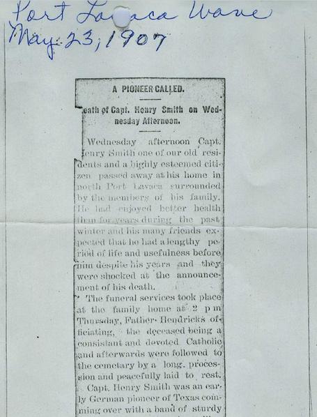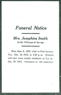 Henry and Josephine are interred at the Port Lavaca Cemetery (28°36'N 96°37'W), Henry passing on May 22, 1907, and Josephine on December 28, 1912.