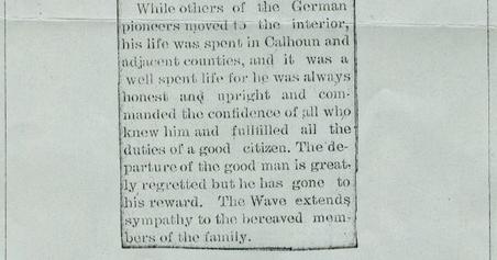 Although he secured the familiy's homestead grant (as per Anna Maria's contract) for 640 acres in Mason County, he preferred living in Calhoun County, never left the coast and eventually sold the land. Henry made his living fishing and was the captain of the schooner Alice Helen[1], a regular mail packet as shown in this newspaper advertisement.
