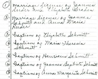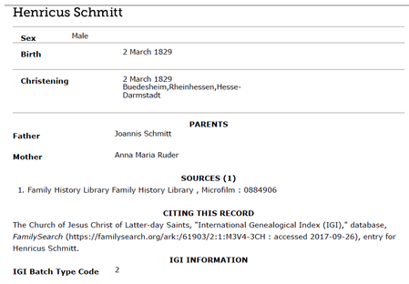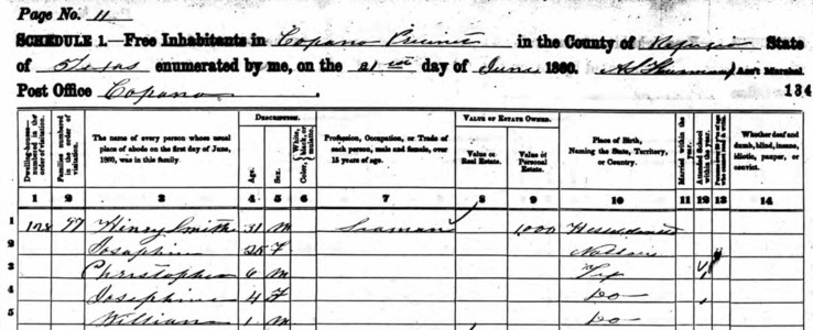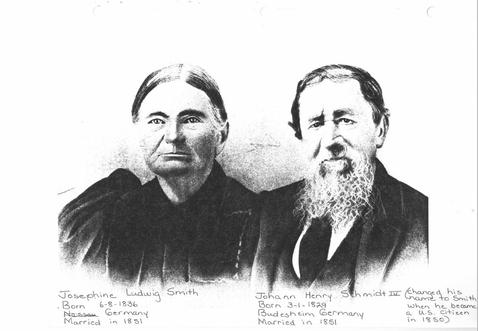 Henricus Schmitt was born in Büdesheim, Mainz-Bingen, Germany(50°13′N 6°33′E) on March (1)2, 1829, to parents Johann and Anna Maria Schmitt. Josephine Ludwig was born in Kiedrich (50°02'N 8°05'E), the Duchy of Nassau, on June 8, 1834(5), to parents Christpoher and Catherine Ludwig. Henry and Josephine each came with their parent(s) and siblings from their homeland in Germany, arriving at Indianola in 1845 and 1846, respectively. Henry became a US Citizen in 1850(6) and at that time changed his last name to Smith.