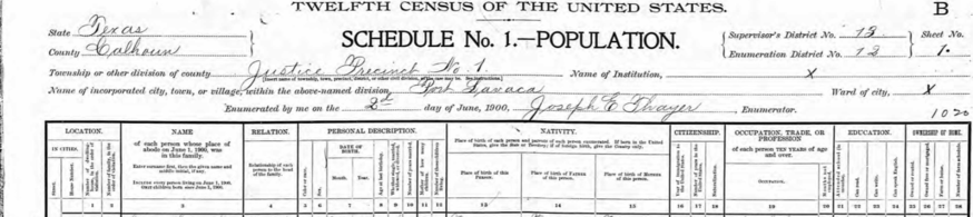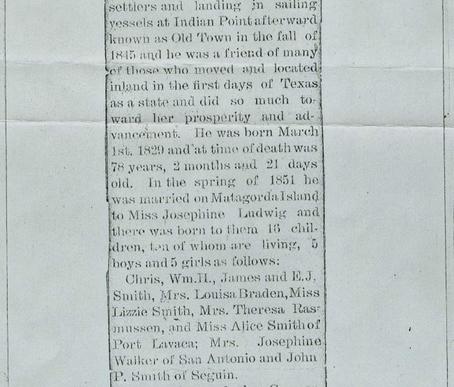 The 1880 Census lists Henry’s occupation as a Farmer. In 1884, his daughter Louisa marries George Braden, future business partner of William Henry. Henry and Josephine moved to Port Lavaca after the storm of 1886. Henry ran a grocery store in Indianola and later in Port Lavaca, where the "regulars" were known to play dominos. The 1900 Census lists Henry as being a Grocer. By 1910, according to Census data, Josephine was living with adult children James, Lizzie and Alice M. on Noble Point Road.