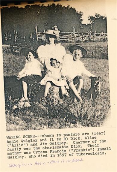 Allie Quigley is shown here (oldest in the center back) with her siblings. The Quigley's lived in Waring, TX just northeast of Boerne on the Guadalupe River. The train from Port Lavaca went through San Antonio and right in front of Allie's house (her dad was a Railroad Man). Owen Smith Jr. as a school child would spend summers with Quigley grandparents. Even though the town depot was about a 100 yards down the line, they would stop the train in front of his grandparents house and drop him off there!! A lot of people from the area would take the train down to the coast to Port Lavaca and surroundings for the beach, water, fishing etc. Perhaps that is how Owen and Allie met?