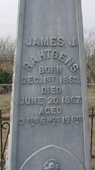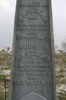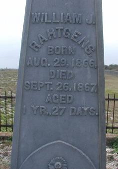 Children who died before reaching adulthood were James A. Rahtgens (1855 - 1858), Richard Rahtgens (1859 - 1859), James J. Rahtgens (1863 - 1867), and William J. Rahtgens (1866 - 1867).