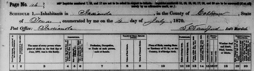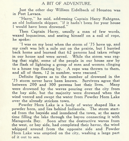 SOURCE: Indianola Scrap Book, Page 185, Originally compiled and published by THE VICTORIA ADVOCATE, Victoria, Texas, 1936; Republished: 1974 by Calhoun County Historical Survey Committee, George Fred Rhodes, Chairman, Port Lavaca, Texas. Published by The Jenkins Publishing Company, San Felipe Press, Austin. Reprinted with an index compiled by Leonard Joe McCown