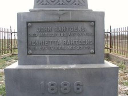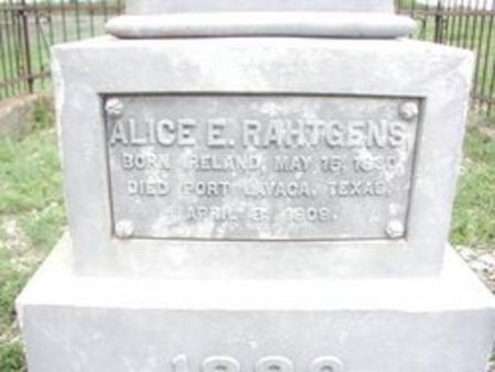 All of the members of this family, except Alice Ellen Smith, are buried in the Old Town Cemetery near Indianola. Henry Rahtgens died in Indianola in 1879. John died on a train near El Paso in March 1886 and Nettie died in Indianola in October 1886 (2 months after the hurricane of 1886 and 1 month after Indianola was again flooded by the storm surge of yet another hurricane). Alice Ellen Smith died in Port Lavaca in July 1905. Alice Ellen Rahtgens died in Port Lavaca in 1909 of Spanish Flu and Harry died in Port Lavaca in July 1923.