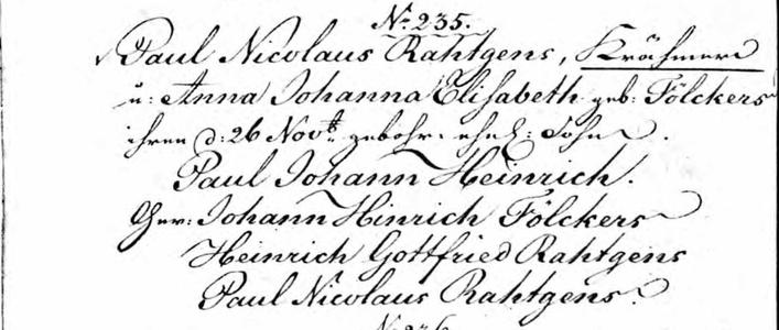 Note: H.G. Rahtgens was one of the first three book printers in Lubeck. His son, Johannes Nicolaus Heinrich Rahtgens, made the printing company reknown for graphic arts. A grandson, Karl Ernst, was a member of the July 20 Plot to assasinate Hitler.