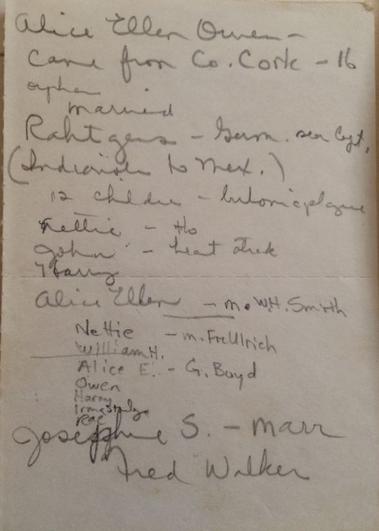 Alice Ellen Owen(s), was born in County Cork (51°54'N 8°29''W) , Ireland, on May 15, 1830. She came to America with a group of other Irish emigrants in 1845, as an orphan girl. The only relative that was mentioned was a cousin, Lady Clara Todd, who was married to a nobleman and lived in London.