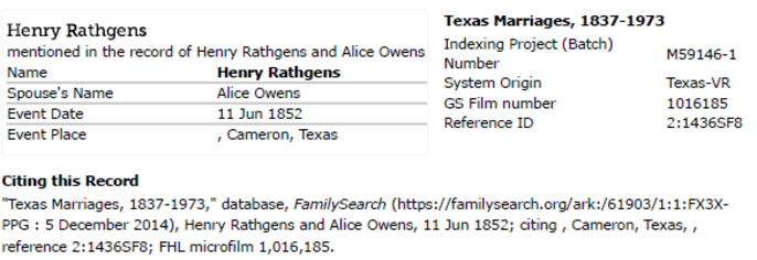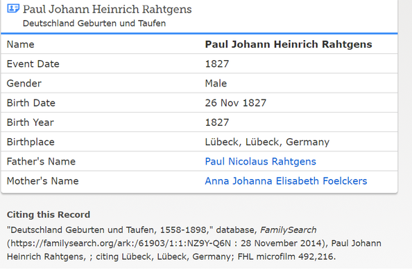 Among the many immigrants to this country in 1845 was Paul John Henry Rahtgens, known as Henry, born in Lübeck, Germany (53°52'N 10°41''E), November 11, 1827, to Paul Nicholas and Anna Johanna Elisabeth Voelckers Rahtgens. While German Census records, Calhoun County tax records and some family accounts show the name spelled as Rathgens, John Henry’s baptismal records and the family monument in Indianola uses the spelling Rahtgens, so latter will be used hence in this summary.