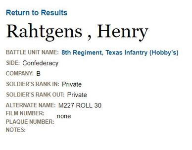 Confederate records indicate Henry served in the Eight (Hobby’s) Infantry in 1861 then the 4th Battalion Texas Artillery (Shea’s). His rank was that of a private until his disability discharge in July 1862.