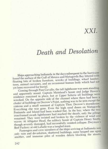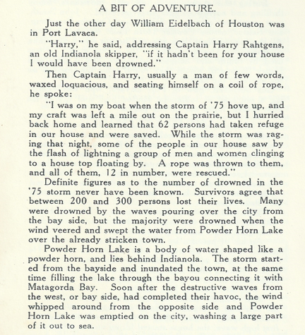 SOURCE: Indianola Scrap Book, Page 185. Originally compiled and published by THE VICTORIA ADVOCATE, Victoria, Texas, 1936. Republished: 1974 by Calhoun County Historical Survey Committee, George Fred Rhodes, Chairman, Port Lavaca, Texas. Published by The Jenkins Publishing Company, San Felipe Press, Austin. Reprinted with an index compiled by Leonard Joe McCown